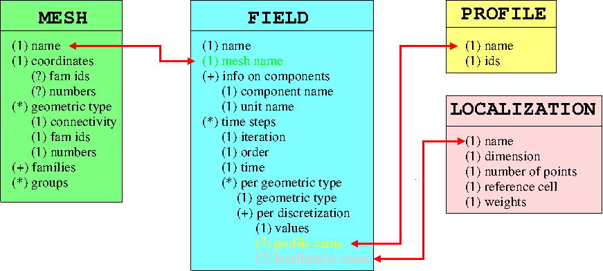 Boxes instances are linked each other only by red arrows using string as discriminating key.** It implies that empty names in basic concepts objects of MED file are forbidden.