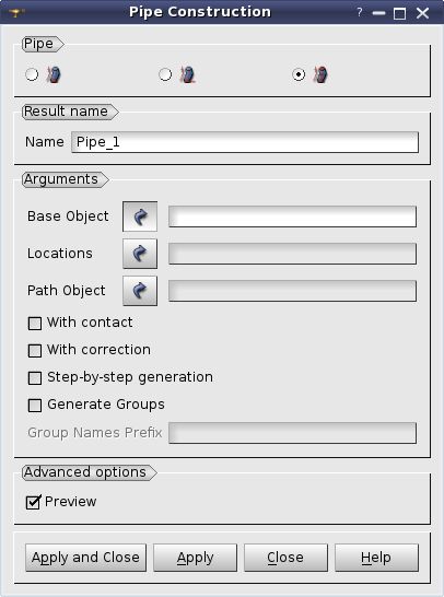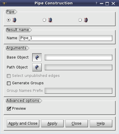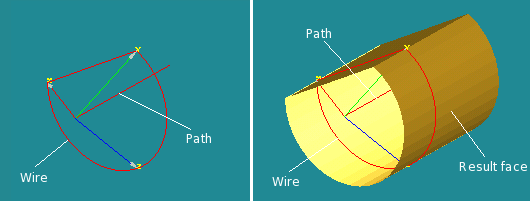 Arguments: Name + 1 shape (vertex, edge, planar wire, face or shell) serving as base object + 1 shape (edge or wire) for definition of the path + 1 boolean parameter (IsGenerateGroups).