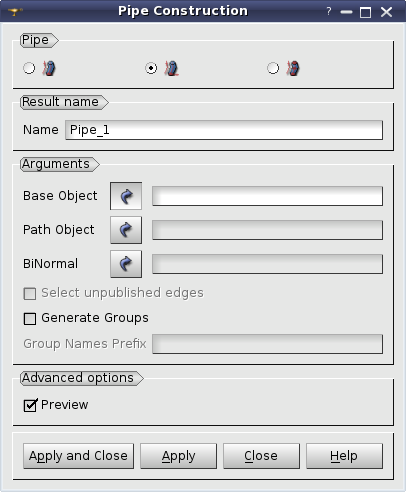 Secondly, you can define the Base Object (edge, planar wire or face), which will be extruded, the Path Object (edge or wire) along which the Base Object will be extruded and the BiNormal Vector (edge or wire).