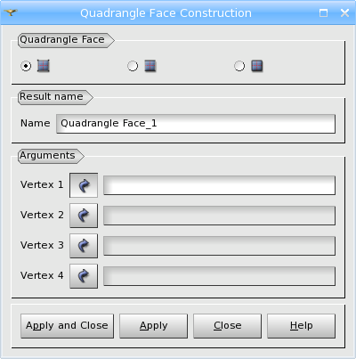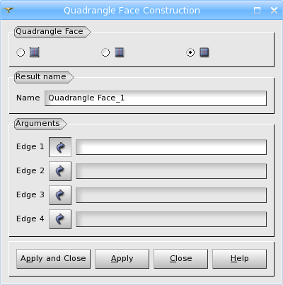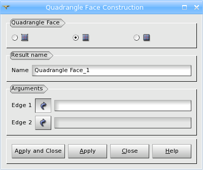 Secondly, you can define a Quadrangle Face by two edges, while the other two edges are created automatically. TUI Command: geompy.MakeQuad2Edges(E1, E2) Arguments: Name + 2 Edges.