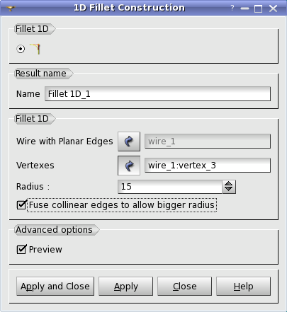 This operation creates fillets on the corners of a Wire with Planar Edges. Note that each couple of edges connected with a vertex, where 1D fillet should be constructed, have to lie in the same plane.