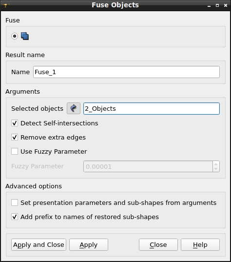 Arguments: 2 shapes + an optional flag for self-intersection check + an optional flag to remove extra edges + an optional name + an optional fuzzy parameter.