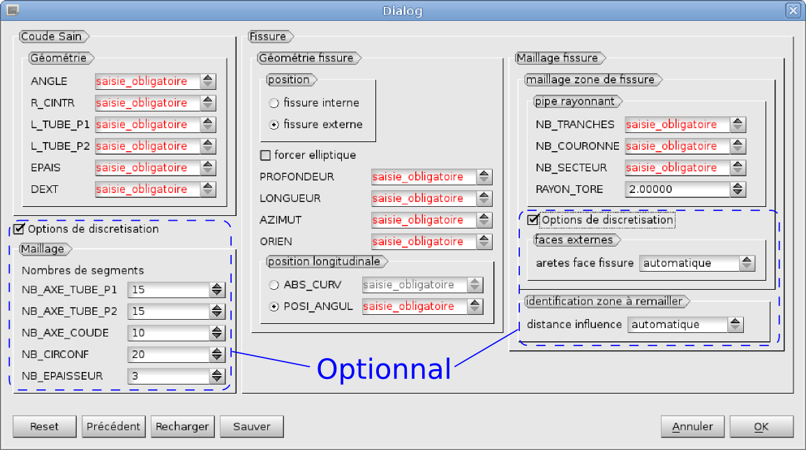 Cracked bended pipes being a common encountered case, a specific module was developed with a Graphic User Interface (GUI). GUI is accessible in the SMESH extension Meshed Pipe with a crack. Compared to the classical use of « Bloc Fissure », this extension also generate the pipe mesh and the crack geometry from geometrical information.